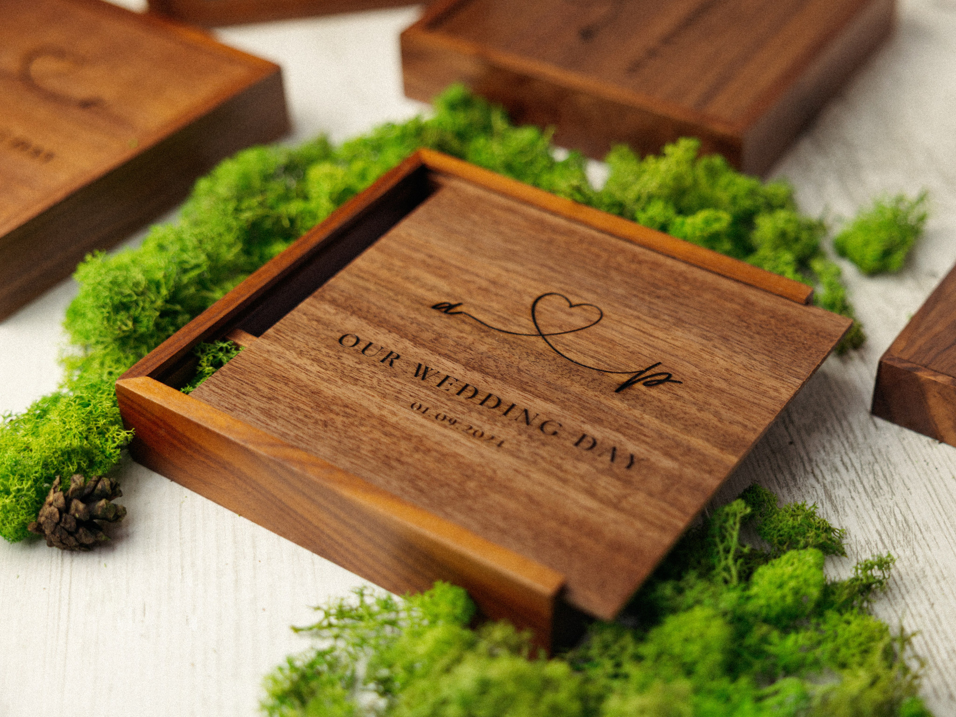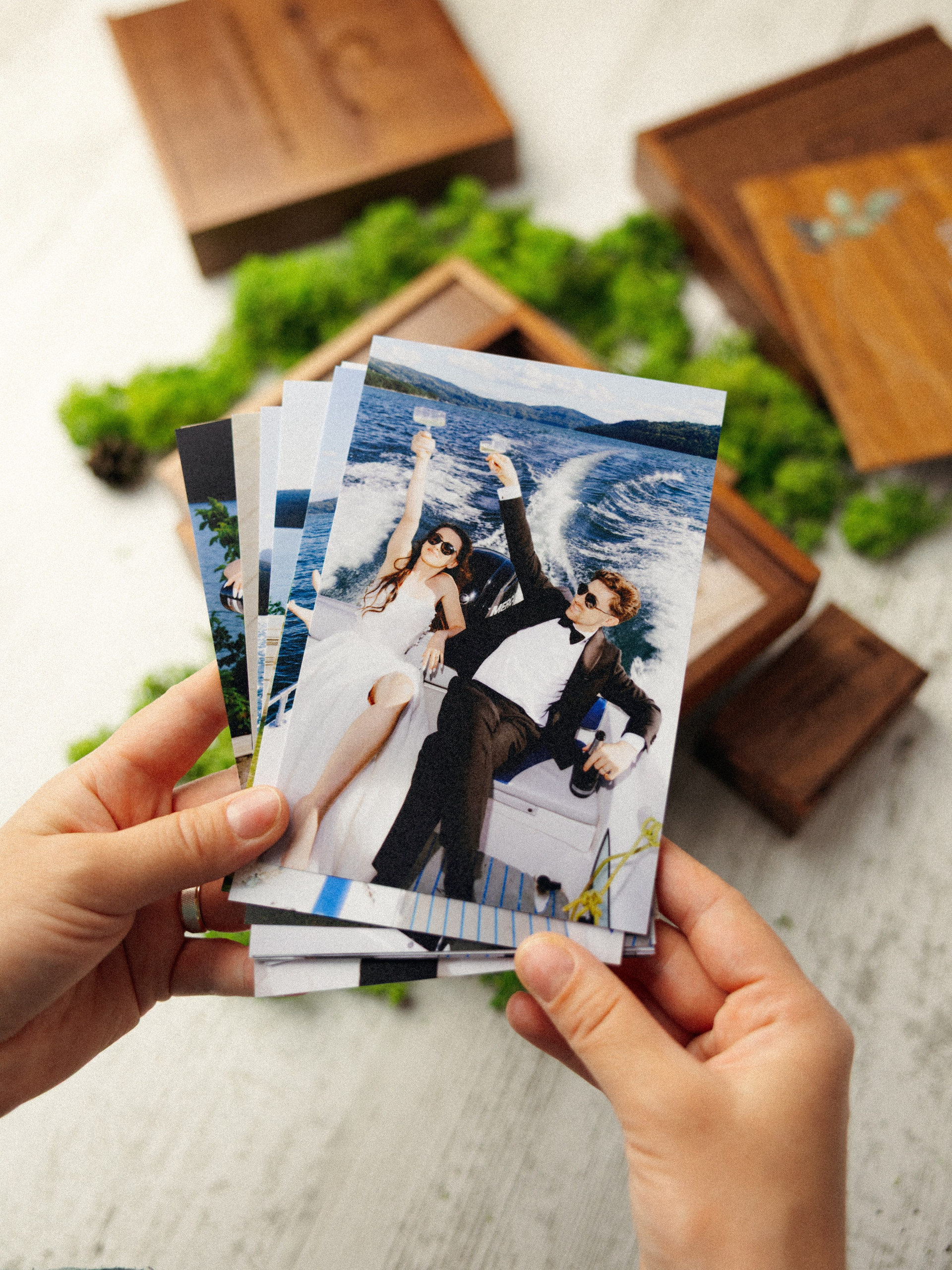 Fotografiile voastre vor fi livrate într-o cutie din lemn natural, personalizată special pentru voi.
